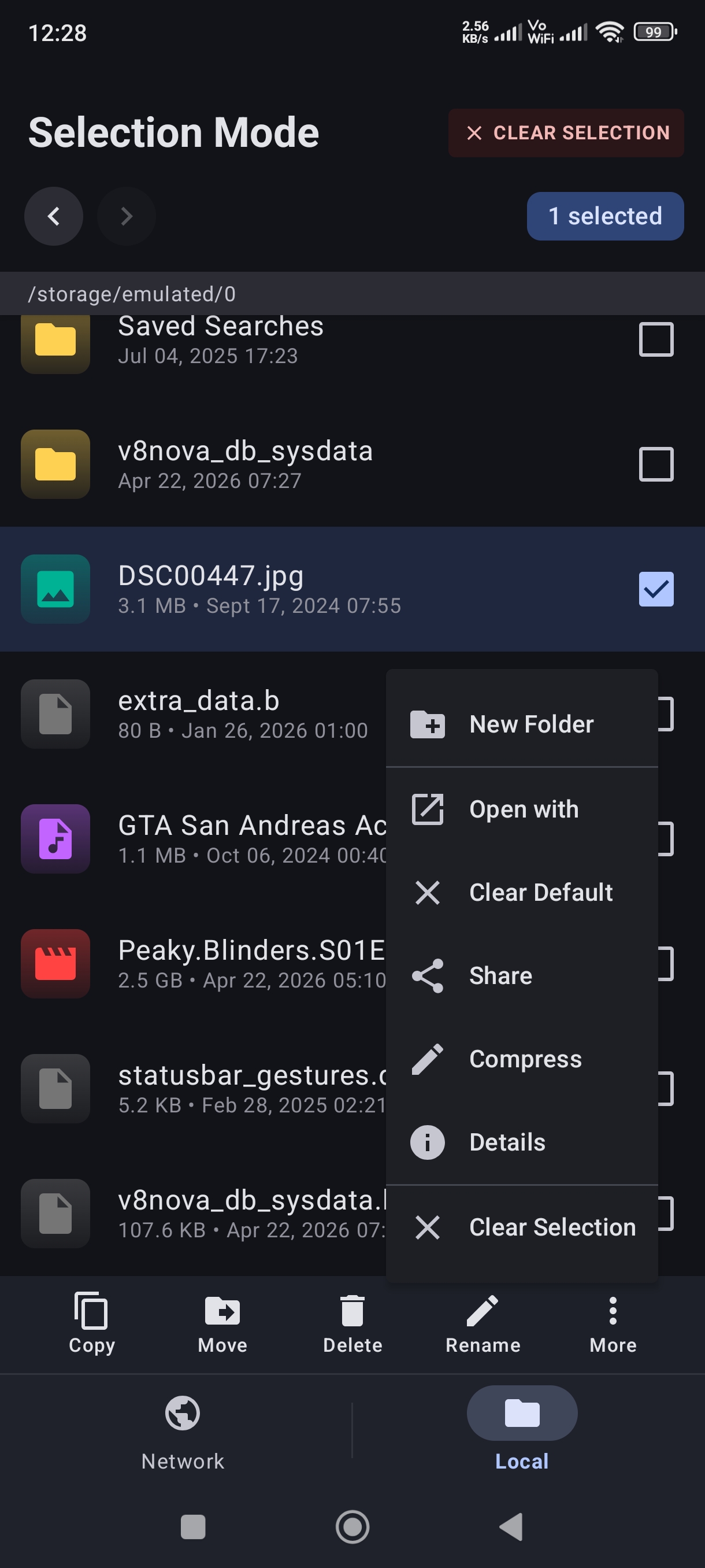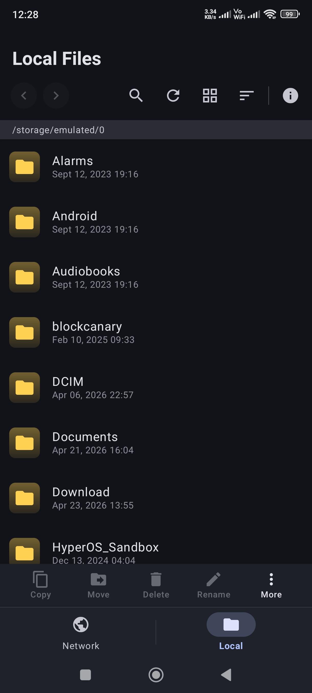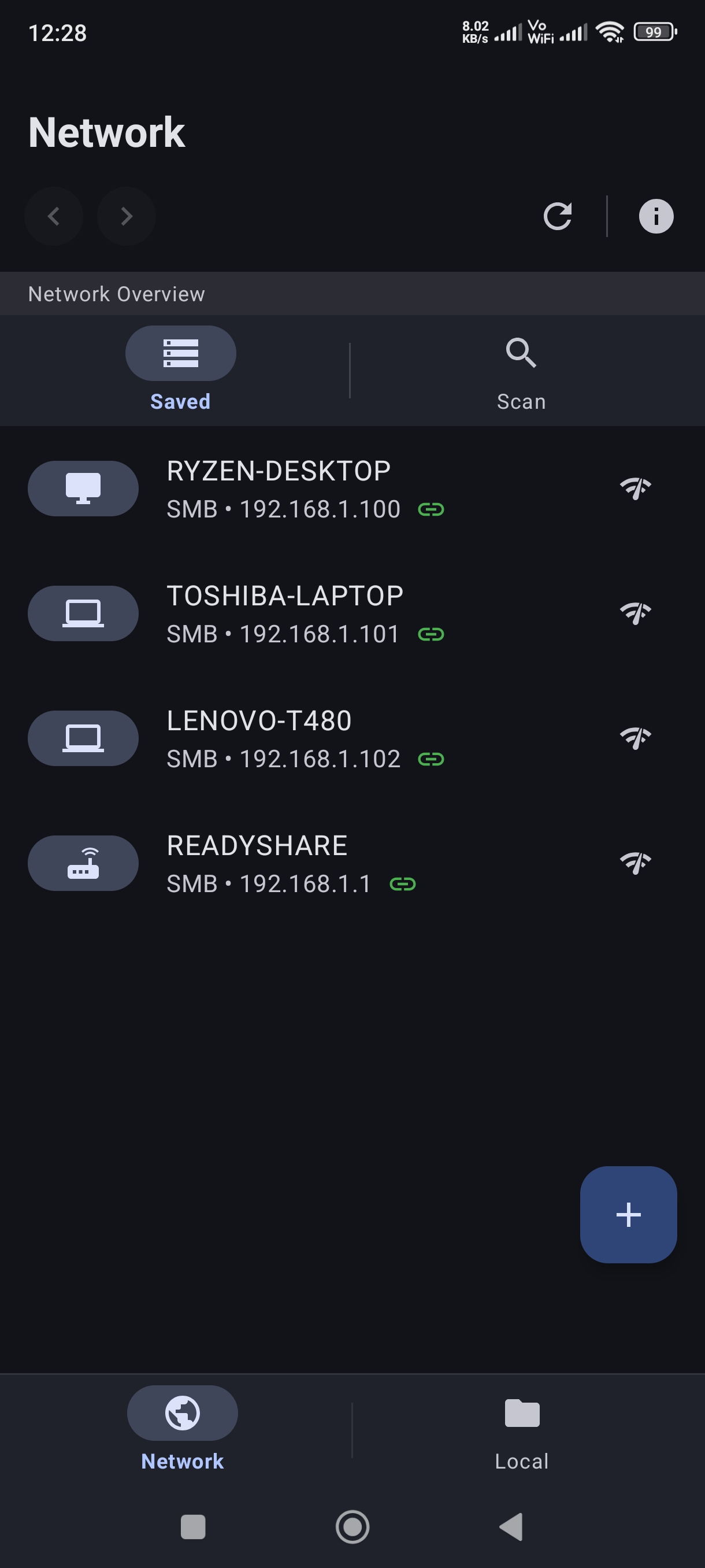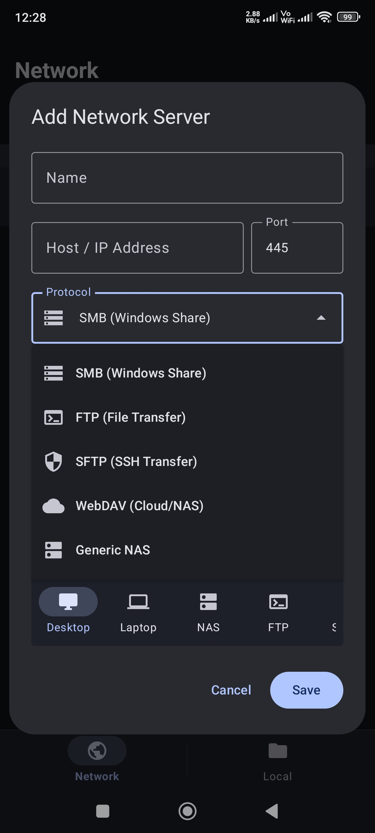 - Network: Supports SMB (jCIFS), FTP (Apache Commons Net), SFTP (SSHJ), and WebDAV (Sardine).